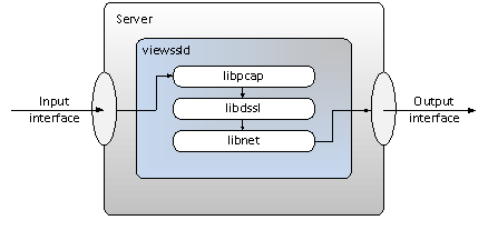 viewssld listens on a given interface via the usual libpcap for nominated SSL traffic. The captured frames are then passed on to Atomic Labs' libdssl library which handles the actual decryption (the latest version of libdssl at the time of writing is 2.1.1, available via svn here).