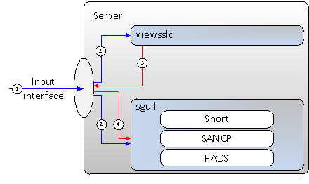 - viewssld decrypts what it can and pumps it back onto the interface it captured it from (red arrows). This is only made possible by using a different TCP port for the decrypted frames – if it used the same port it would re-enter viewssld again.