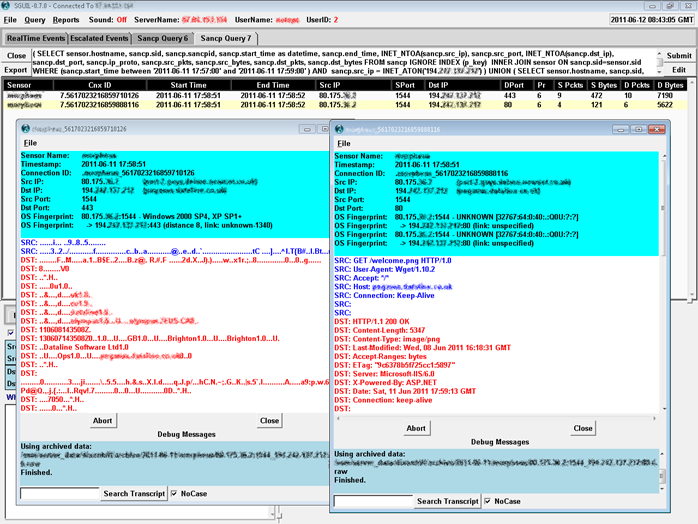 Sguil/SANCP/Snort/PADS/etc. therefore see both the encrypted and the decrypted traffic, as shown in the screenshot below. In the background you can see a SANCP query with two rows of results. The first row is the raw SSL traffic captured by Sguil on port 443; the second row shows Sguil capturing the corresponding fake decrypted stream output by viewssld on port 80. The two transcript windows tell the rest of the story: