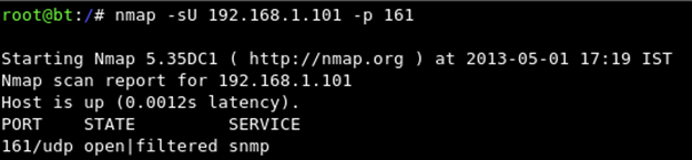 Nmap could be downloaded from http://www.nmap.org. It is freely downloadable. Once installed, run the command as shown below on the target to see if SNMP is enabled.