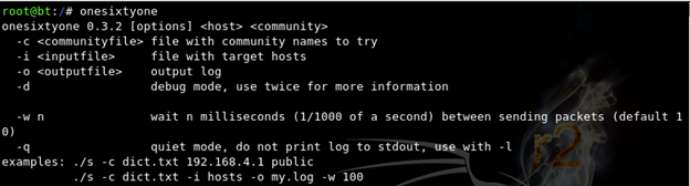 We'll be using a small utility available in backtrack for the same. The tool is known as "onesixtyone". To invoke this utility, just type "onesixtyone" at the command prompt and you'll see something like the following:
