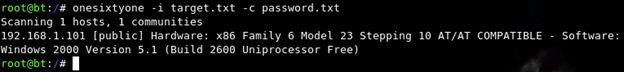 We'll now run the Onesixtyone against our identified target to do a quickly check if it is running on the default community string. However, before that, let us create input files which we can feed to the tool.