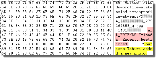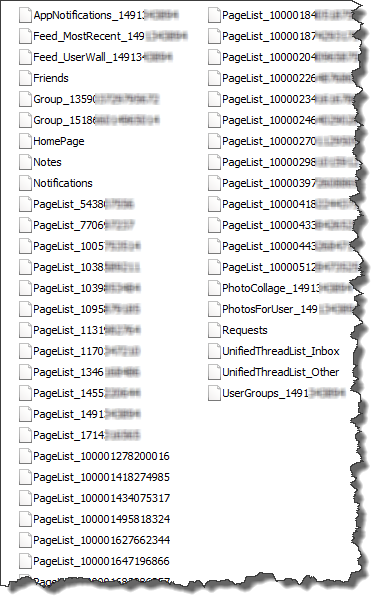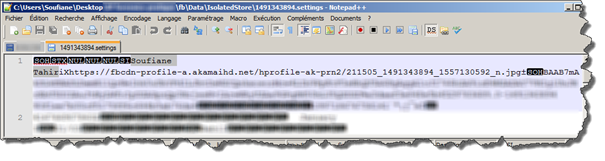 DataCache.userID , contains almost everything you need to know about the Facebook user having that ID (in this case 14913XXXX is mine, and the one starting with 5472 is probably a friend who connected to Facebook using my phone) this folder may contain the user's friends with some details about them like birthdays, link to their profile pictures…, friend requests, incoming and outgoing messages, recent Facebook feeds, user's notes and may even contain the last user's location if the option was enabled… and ALL data is not encrypted and can be easily parsed!