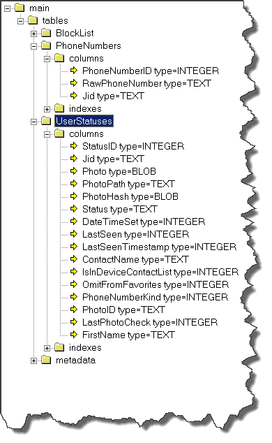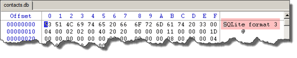 Then two interesting files "contacts.db" and "messages.db". Obviously these are SQLite databases as seen here: