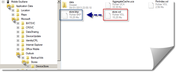 Outlook data is stored in the directory ApplicationDataMicrosoftOutlookStoresDeviceStoredata and its subdirectories. All these subdirectories are numerated and each of them contains different data: