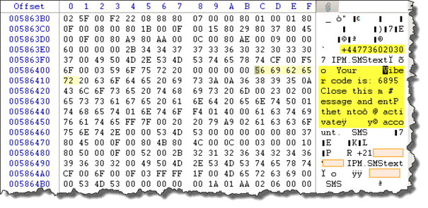 As you can see "Your Viber code is: 6895…" sent from "+44773602030", all SMS's either sent or received start by "IPM.SMStext" which can make it easy finding them or maybe automating the process of extracting them.