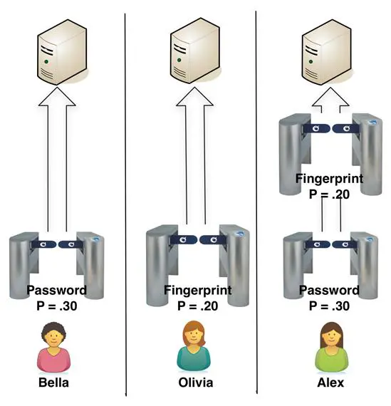 To demonstrate how a probability calculation might work, lets use an example of three approaches to restricting access to a patient care database, as shown in Figure 11-1. Bella uses only password authentication, Olivia uses fingerprint recognition biometrics only, and Alex uses both a password and fingerprint recognition.