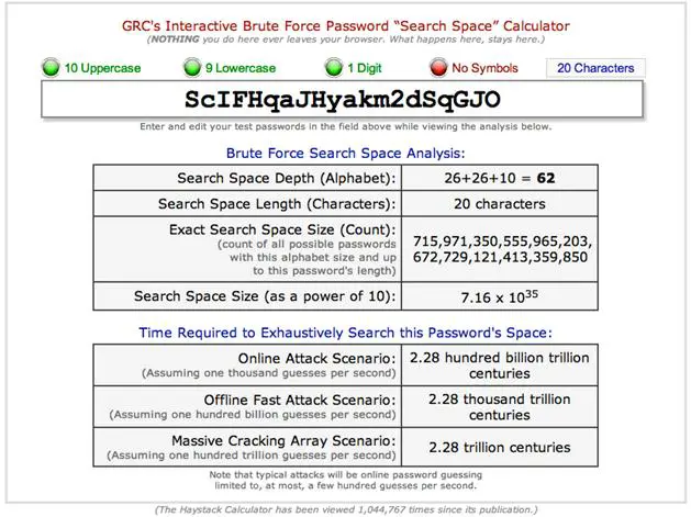 I did not require special characters because some implementations do not support anything other than alphanumeric entries. However, our example receives a Strong rating when submitted to the password checker at the Microsoft Safety and Security Center (http://mcaf.ee/firtg). Figure 11-2, the results from the GRC brute force calculator (http://www.grc.com/haystack.htm), gives a more practical idea of what that means. In other words, it would take more time than an attacker can afford to crack our sample password.