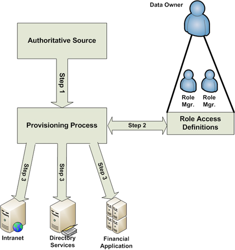 - Provisioning process. Using information from the authoritative source, the provisioning process places or removes subjects from roles. It is either performed manually by administrators (as in many Active Directory implementations) or automated with solutions like those provided by Courion (http://www.courion.com/).