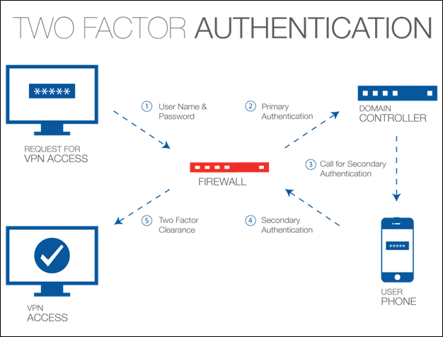 The concept of two-factor authentication is explained in the pic below. Let's suppose you are going to access a VPN website. (1) Here the first authentication is done via traditional credentials such as username and password. This is called primary authentication. (2) Then the domain controller calls on the user's mobile phone or any other device (mobile is a standard device that all users will have) and it will send a token code or an automated call. (3) Then it checks for the right identity. (4) If the credentials are verified, the user will be given authorization to access the VPN as shown in the pic below.
