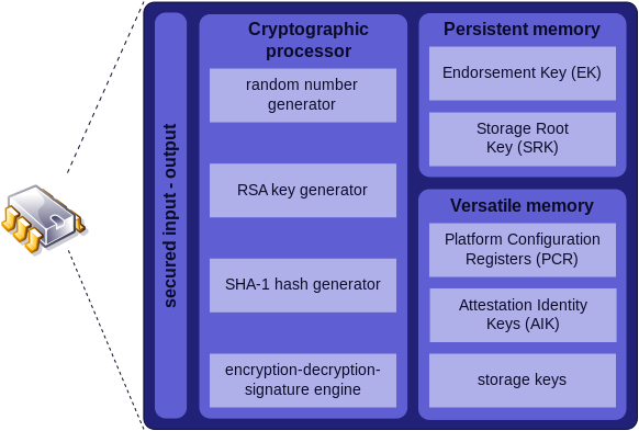 This chip is placed on an endpoint device that stores an RSA key. It makes an RSA key pair that is saved within the chip and cannot be accessed by any software. The SRK (storage root key) is generated only when the system administrator accesses the computer. There is a second key, known as the AIK (attestation identity key). It is there to protect the chip from unauthorized access. They create hashes. If the system wants to connect to the network or end device, it passes the hash and gets verified by the network or another end device. If the match fails, access is denied. This is how it gives complete bullet-proof security against phishing.