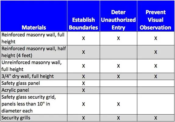 Whether or not a structure is part of a perimeter and the sensitivity of what exists inside the structure affect the types of materials used for the structure's exterior walls. Table 2 provides examples of various wall constructions and the amount of deterrence and delay each provides.