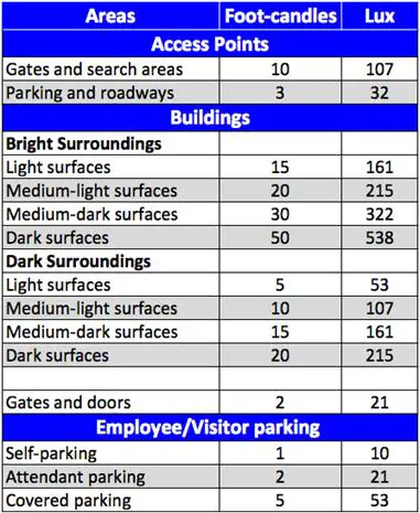 Note that lighting requirements may not be the same for all areas of your site. Selecting a single light source type for placement across your entire site is probably not a good design plan. Areas not specifically covered in the table are perimeter depressions, such as ditches and culverts. For these and other natural or manmade areas of shadow and concealment, consider special lighting placement with the illumination level indicated for gates and doors.