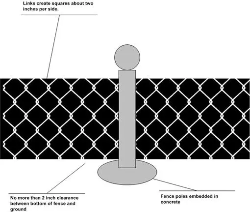 When landscaping and natural barriers do not sufficiently mitigate risk, one of most common choices is fencing. As shown in Table 13-1, fencing characteristics should match the threat type you want to deter and delay. In most cases, an organization is safe enough with one of the chain link designs shown in the table. According to the U.S.G.S (2005), chain link should consist of a mesh of 11-gauge or better wire. To deter an intruder attempting to go under the fence, the bottom links should be no higher than two inches from firm ground. In addition, installers should embed fence posts in concrete, as shown in Figure 13-4.