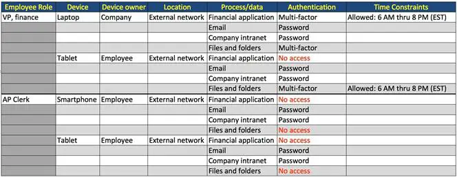 Smartphones are different from laptops, and laptops differ from tablets. They use different operating systems, possess various levels of local controls, and are owned by your organization, another organization, or individuals. Access controls must take into account the various levels of risk. As we saw in the beginning of this chapter, context-based access control provides the most flexibility and the greatest granularity. Table 2 is a copy of Table 1 and depicts examples of controlling access based on various characteristics of a connection.