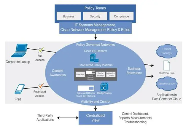 In many cases, regulatory compliance and ethical business practices require restricting access for some contexts. Solutions like Cisco's Policy Governed Network architecture provide centralized control of remote, wireless, and internally wired access control. If the network is properly segmented, access to resources is easily controlled. Access to various VLANs, for example, is controlled based on current context: the user attempting access, the user's location, the device used, and the time of day.