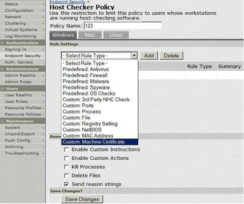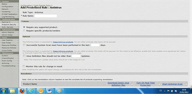 Figures 9-11 and 9-12 are screen shots of a Juniper (http://www.juniper.net/us/en/) host checker configuration console. In this example, the administrator chooses approved anti-malware products and acceptable version levels. When a device attempts to connect, a small application (the host checker) scans to determine current device state. The host checker sends the state information to the access control solution. Device state is checked against a policy server. If the device meets all mandatory conditions, authentication and authorization continues to completion.