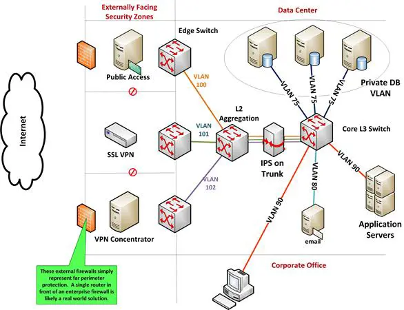 Packets from the demarc pass through a router and on to the firewall standing guard at ingress to the appropriate, outward facing security zone. For example, traffic destined for the public website might travel to one security zone while employee access traffic flows to another. A security zone's ingress firewall provides initial filtering for incoming traffic. Packets making it into the security zone face access policies and VLAN access control lists controlling internal network access.