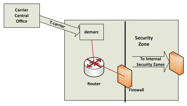 Figure 9-2 depicts a common secure configuration for T-carriers. The carrier (circuit provider) connects a circuit from one of its central offices to a demarcation point (demarc) in the subscriber's (organization leasing the circuit) data center. It is called a demarc because it is the point at which the provider hands off hardware responsibility to the subscriber's network engineers. It is the separation point between carrier and premise (subscriber) infrastructure.