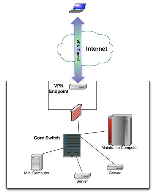 All data passing between the laptop and the VPN endpoint, also known as a VPN gateway, is exchanged over an encrypted connection. The laptop's connection can be any Internet service. The connection from the Internet to a large subscriber's data center VPN endpoint is usually a T-carrier. A cable modem works fine for SMBs with limited remote access requirements. Depending on the type of VPN and configurations of internal resources (including VLANs and ACLs), most if not all access available to an office worker is also available to a teleworker.