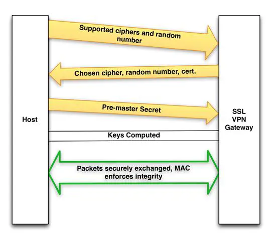 - Step 1: The handshake phase begins with the host sending a list of encryption algorithms it supports. Typically, the host and the gateway settle on the most secure algorithm common to both. The host also sends a random key used later to create a shared secret.