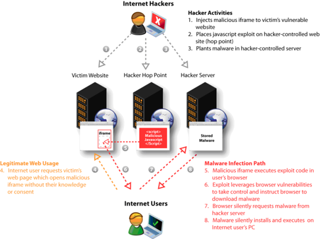 - Internet user requests the victim's website, which initiates the iframe to execute the exploit code in the user's browser without their knowledge.