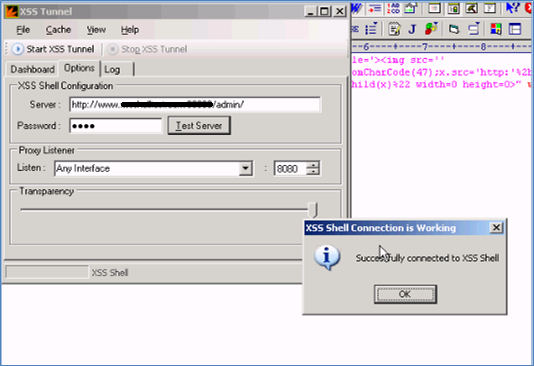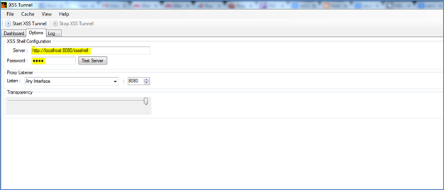 As mentioned earlier, the XSS Tunnel acts like a proxy to capture the traffic through the XSS channel opened through XSSshell server. In order to do this, the XSS Tunnel should be able to understand where the XSSshell server is running.