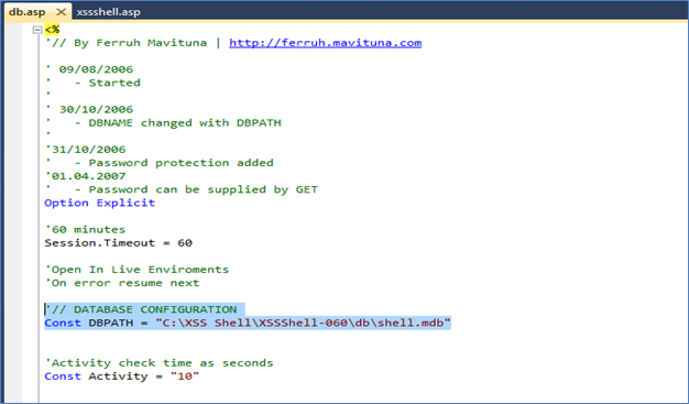 - After moving the "db" folder to a secure place, configure the path in "db.asp" file under "XSSshell/admin" folder, so that the interface can understand where the db is and interact with it.