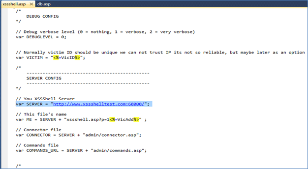 Figure G shows the configuration of server path in xssshell.asp file. Edit he parameter "SERVER" to the place to the location of "XSSshell" folder in your machine.