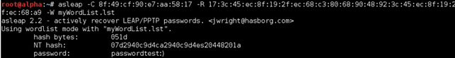 The last step is to get the credentials in clear text from authentication exchange. For this activity, we will use the Asleap tool with which we can perform an offline attack based on dictionary. Alternatively, you can use John the Ripper, by specifying the NETNTLM format.