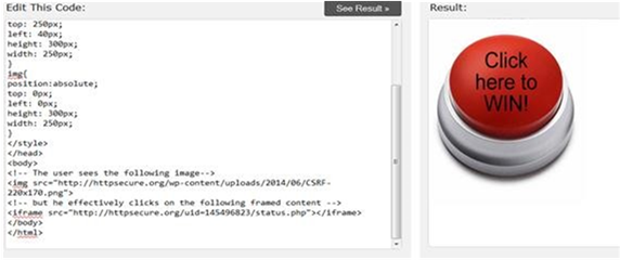 If the user clicks on the button, the hidden HTML form loads inside the iframe and send the value. This is a simplest example of how a user can be fooled into performing unwanted actions. Even if the application relies on an Anti-CSRF token, it does not impact the delivery of the clickjacking attack. This is because the resource to be framed is loaded normally and contains a valid Anti-CSRF token.