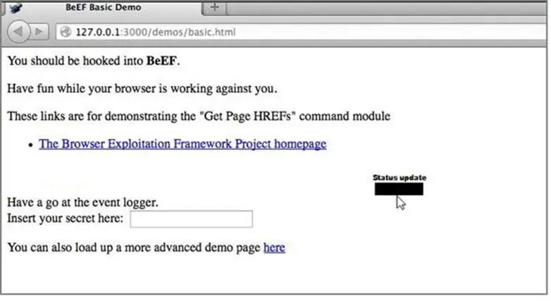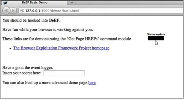 The clickjacking BeEF module with the preceding HTML as the inner iframe will send all clicks to the iframe. The iframe is following the mouse movements. So, wherever the user clicks on the page, they will be clicking the status update button.