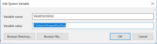 In Firefox and Chrome, this can be accomplished by setting an environment variable called SSLKEYLOGFILE. If this variable is set, both browsers are configured to save a copy of the client’s secrets to the indicated file location. On Linux, this variable can be set using the Export command. On Windows, it can be set by opening Advanced System Settings, selecting Environment Variables and then adding a new System Variable. An example of this variable in Windows is shown below.