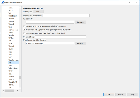 At the bottom of this screen, there is a field for (Pre)-Master-Secret log filename. As shown above, you need to set this value to the same location as the SSLKEYLOGFILE for your browser. When done, click OK.