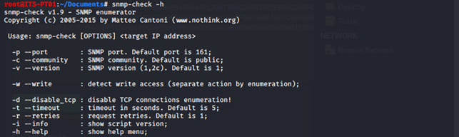 To launch snmp-check, open the Kali Linux terminal and type “snmp-check”. You will receive a screen similar to the following: