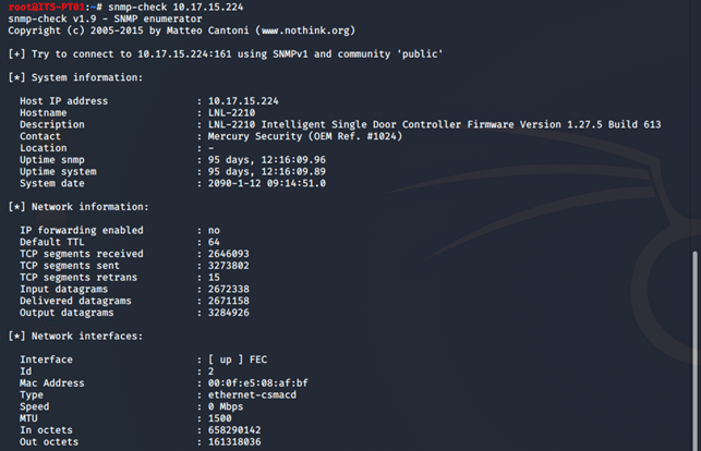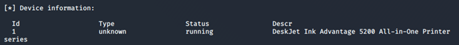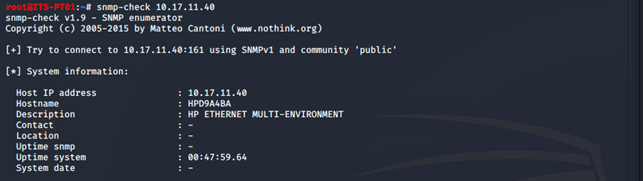 snmp-check is able to expose the system information of the affected printer. The amount of information that we are able to access will depend on the MIB records available and type of device being accessed.
