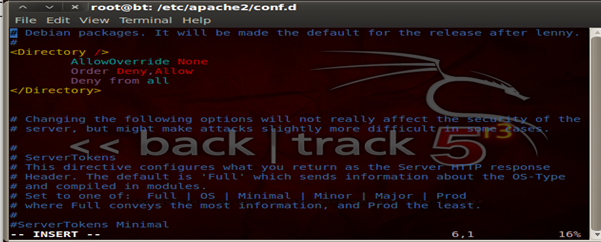Always remember it's the best security to deny all and only allow specific services, ports and firewall rules as per the configuration. So the same goes for Apache as well, we follow a whitelisting technique to deny all and only allow what is required. Hence what we have done here is to block access to all the directories. These configurations and changes have to be done in the main configuration file of Apache, or if you are using a newer version of Ubuntu/ Backtrack r3 they can be found under/etc/apache2/conf.d/security