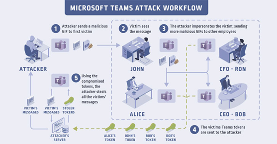 - The victim opens and sees the message with the GIF image embedded. At this point, the criminal impersonates the victim and spreads the GIF image with the payload in the organization’s Teams accounts like a worm, infecting a large group of employees.
