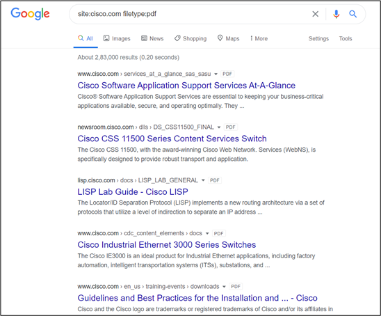In Google dorking, the hacker takes advantage of Google’s advanced search capability to find only the data type he has requested. This reduces the Google search result to show the unwanted result which may be not very useful for the hacker. For example, if a hacker wants to search the PDF document for a website that is available on public sites, he will do the following query to get the desired result: