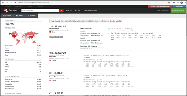 First, a hacker will search for “FTP anonymous.” From there, you can filter the results. In the left sidebar, we see a good amount of summary data: