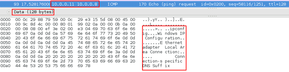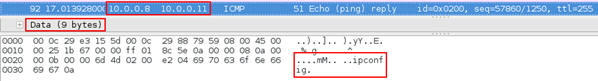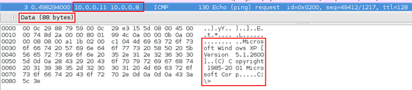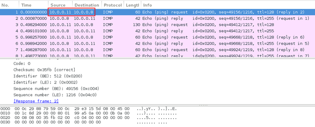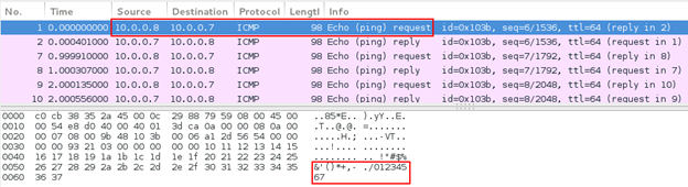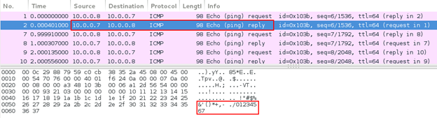 Looking at the ping echo request and response, we can see that the ping echo request ICMP packet sent by network device A (10.0.0.7) contains 48 bytes of data. Network device B (10.0.0.8) replies with a ping echo response with the same 48 bytes of data. See the image below: