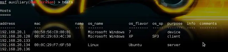 The results of this scan are stored in the Metasploit database for use at a later time and to be accessed with the "hosts" command.