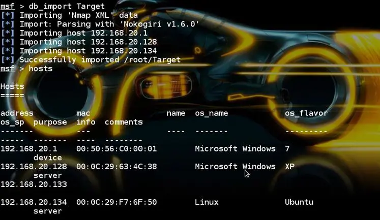 After generating the XML file, we use the db_import command to import it into our database. We can then verify that the import worked by using the "hosts" command, which lists the systems entries that have been created, as shown here: