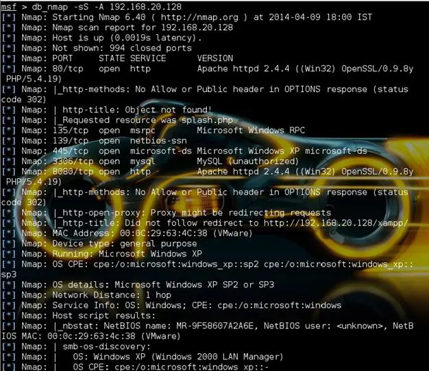 We've performed advanced enumeration on our target, now let's connect Nmap with Metasploit. First, we should be able to enter the db_nmap command from within msfconsole to run Nmap and have its results automatically stored in our new database.