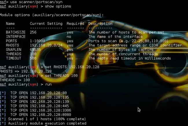 Let's conduct a simple scan of a single host using Metasploit's SYN Port Scanner. In the following listing, we start the scan with use scanner/portscan/syn, set RHOSTS to 192.168.20.0/24, set THREADS to 100, and then run the scan.
