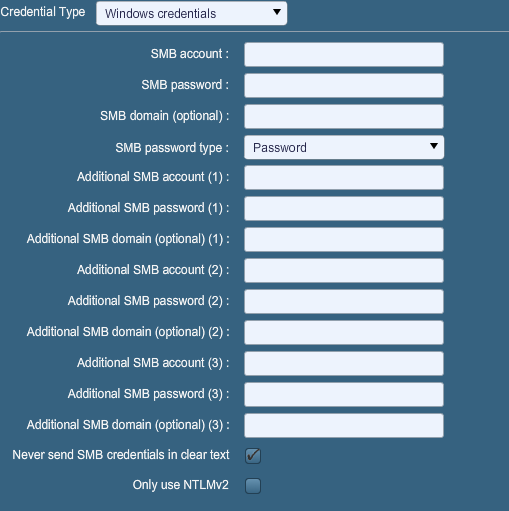 We can use credentials to login into several services automatically by Nessus, which should determine if security patches are applied and if the latest version of software is being used. In the drop-down menu we have the option to choose one of the following options: Windows credentials, SSH settings, Kerberos configuration or Cleartext protocol settings. All of these allow us to input the credentials for the following services: SMB, SSH, Kerberos, telnet, rsh and rexec.