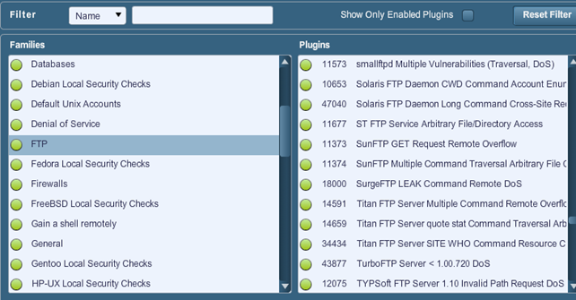 Allows us to choose a specific security checks to be performed against the target website. On the picture below we can see the enabled category FTP that will try to detect an anomaly in the FTP server; it will do that by checking the existing FTP server against all the defined plugins on the right that represent all currently known vulnerabilities in FTP servers: