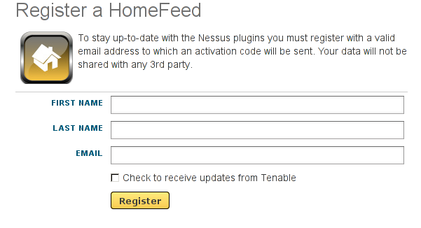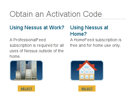 The error message says that there is no nessus-fetch.rc file present. This file is automatically created when we activate our Nessus installation with an activation code. To obtain an activation code, we must visit Nessus Activation Code and choose "Using Nessus at Home", which is shown in the picture below: