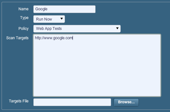 Here we can create a new scan by defining the hostname of the target website and the policy the scan will use. This can be seen in the picture below, where the target website is http://www.google.com and the scan policy is one of the defaults ones, the "Web App Tests" policy.
