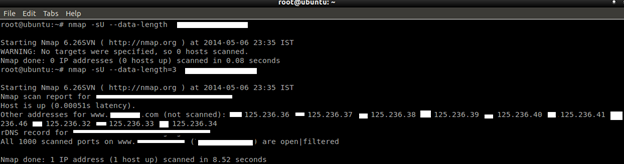 The --data-length option can be used to send a fixed-length random payload to every port or (if you specify a value of 0) to disable payloads. If an ICMP port unreachable error (type 3, code 3) is returned, the port is closed. Other ICMP unreachable errors (type 3, codes 1, 2, 9, 10, or 13) mark the port as filtered. Occasionally, a service will respond with a UDP packet, proving that it is open. If no response is received after retransmissions, the port is classified as open|filtered.